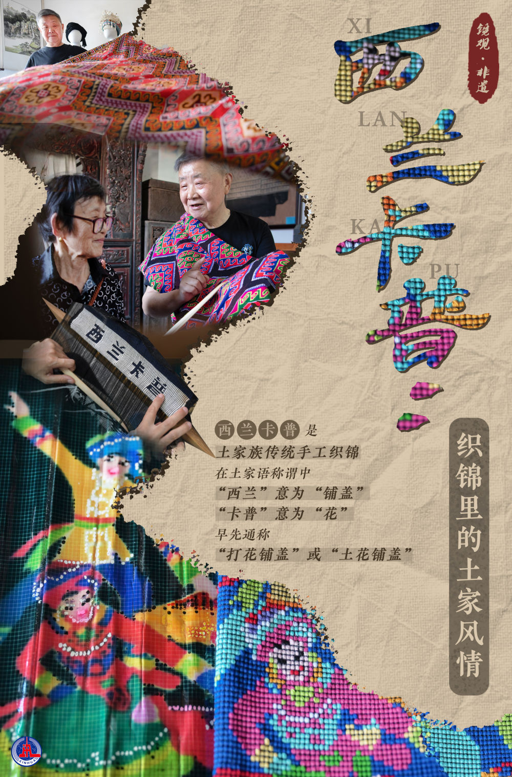 西蘭卡普是土家族傳統(tǒng)手工織錦,在土家語稱謂中,“西蘭”意為鋪蓋,“卡普”意為花,早先通稱“打花鋪蓋”或“土花鋪蓋”。土家孩子出生時外婆要送織錦,嬰幼兒時要蓋織錦,女孩子自小學(xué)習(xí)織錦,出嫁時在織機(jī)上制作西蘭卡普作為陪嫁。西蘭卡普記錄了土家族的風(fēng)俗和情感,與土家人的生活息息相關(guān),被譽為土家族的“五彩活化石”,2006年被列入國家級非物質(zhì)文化遺產(chǎn)名錄。