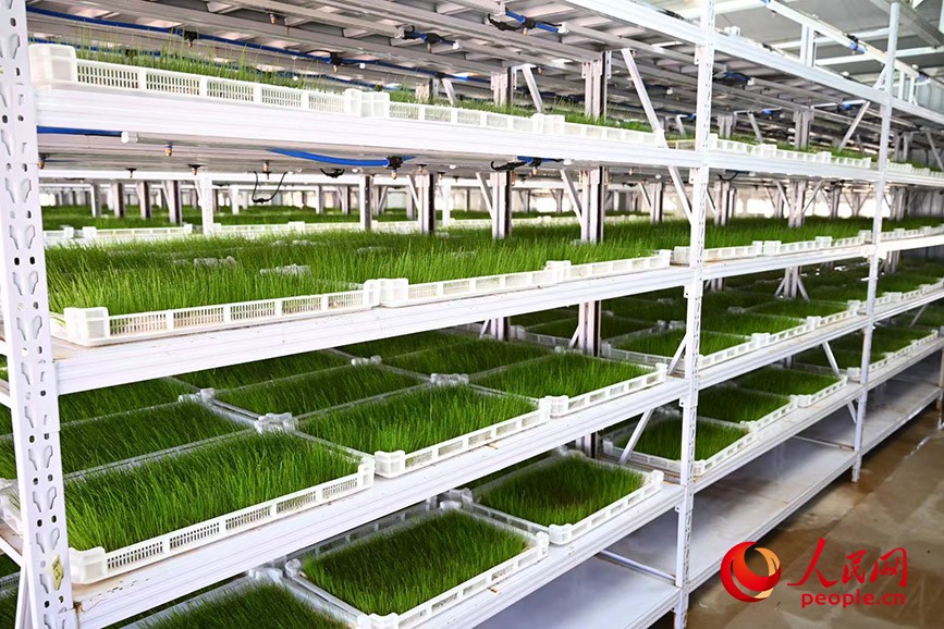除了飼養(yǎng)蘇尼特羊的棚圈之外,牧場中還設(shè)計了一座溫室房,里面整齊排列的架子上,種植著郁郁蔥蔥的燕麥草,這里被牧民親切地稱為“空中牧場”。