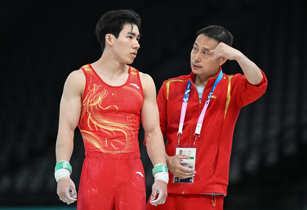 7月24日,中國男子體操隊在巴黎進行賽臺訓練,中國隊選手張博恒(左)在準備吊環(huán)項目訓練。新華社記者 程敏 攝