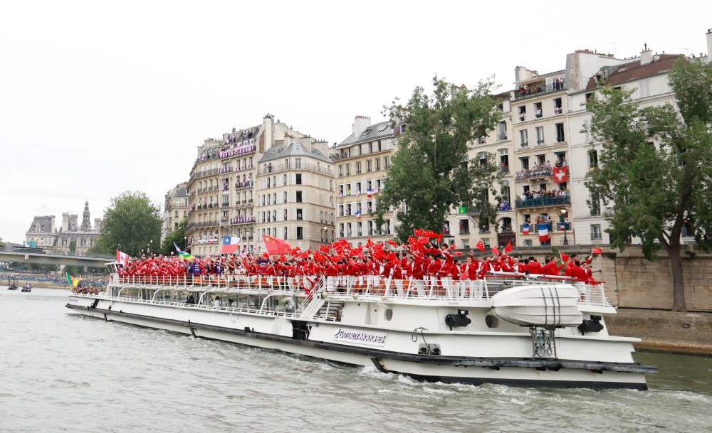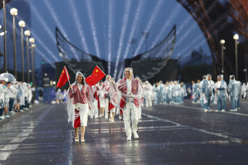 當(dāng)?shù)貢r(shí)間7月26日,第33屆夏季奧林匹克運(yùn)動(dòng)會(huì)開(kāi)幕式在法國(guó)巴黎舉行。乒乓球運(yùn)動(dòng)員馬龍、花樣游泳運(yùn)動(dòng)員馮雨高擎五星紅旗,中國(guó)體育代表團(tuán)運(yùn)動(dòng)員乘船在塞納河巡游。