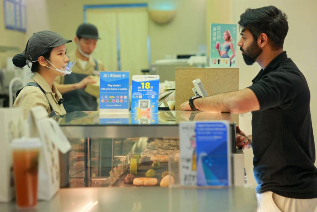 4月8日拍攝的巴基斯坦人冉納在北京藍色港灣一家飲品店用手機掃碼支付購買商品。新華社發(fā)