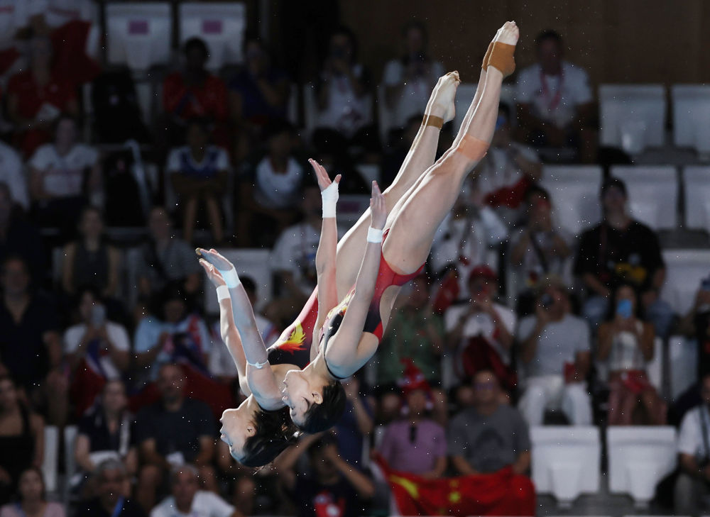 ??7月31日,中國(guó)選手陳芋汐(后)/全紅嬋在比賽中。新華社記者 李穎 攝