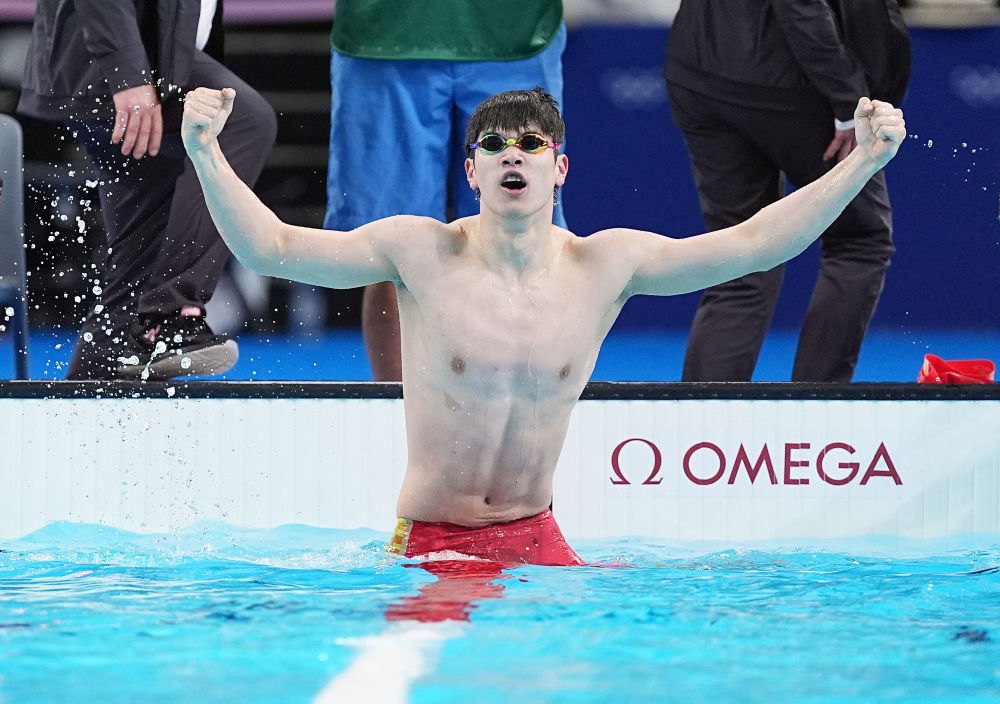 ↑中國(guó)選手潘展樂(lè)在比賽后慶祝。