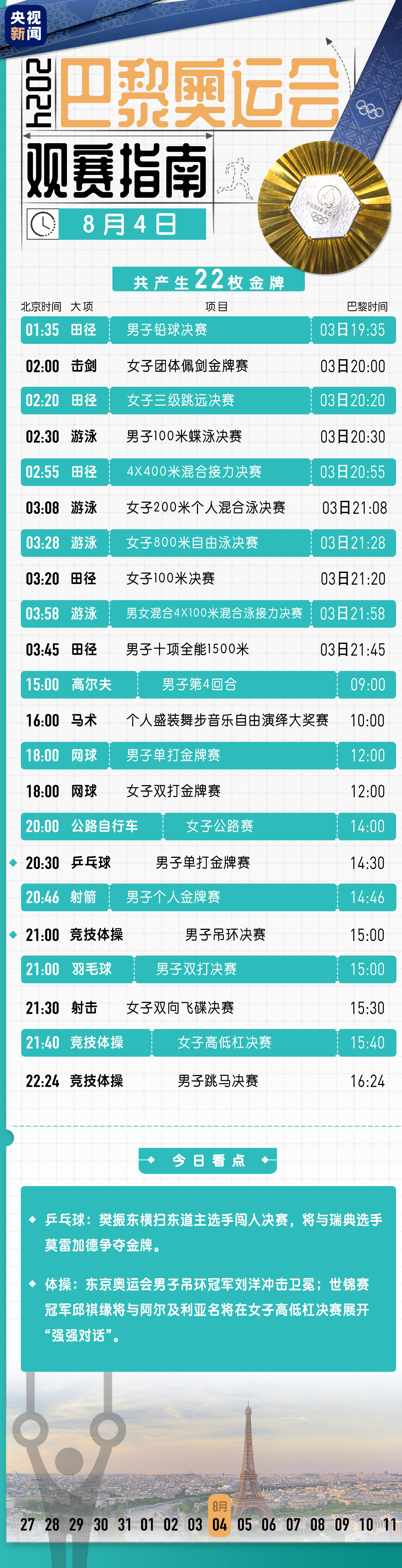 巴黎奧運(yùn)會第九個比賽日將產(chǎn)生20枚金牌。中國體育代表團(tuán)將在乒乓球、羽毛球等項目上沖擊金牌。