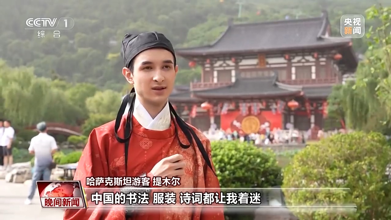 哈薩克斯坦游客提木爾:中國(guó)的書(shū)法、服裝、詩(shī)詞都讓我著迷,今天穿著這身中國(guó)的傳統(tǒng)服飾,體驗(yàn)中國(guó)唐代的宮廷婚禮,這個(gè)經(jīng)歷真的太獨(dú)特,太珍貴了。