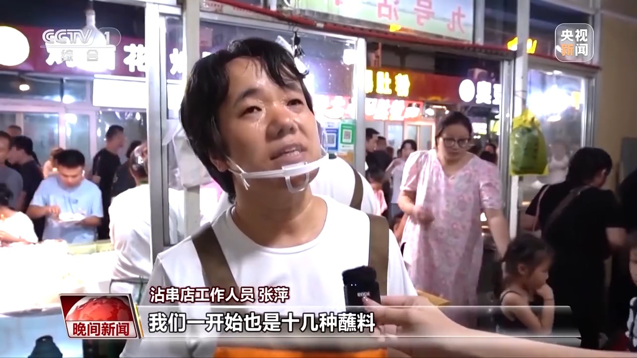 夜幕降臨、高溫消散,山西太原食品街就迎來(lái)大批食客。食品街的一家沾串店面積不大,食客只能站著吃,但卻吸引大批食客光顧。沾串食材是熟的,食客蘸上各個(gè)口味的醬料就能直接開(kāi)吃。