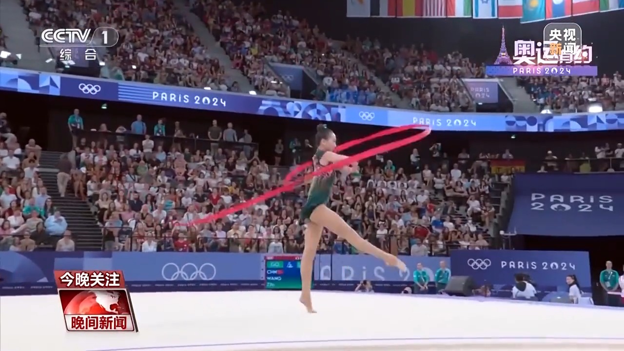 而在藝術(shù)體操女子團體全能決賽中,中國藝術(shù)體操的姑娘們以總分69.8分,拿下該項目的金牌。在決賽三帶兩球項目《鳳鳴凌霄》表演中,伴隨著動聽的音樂,姑娘們靈活地運用彩帶和球,以精準的動作、極具張力的表演,詮釋了漢唐國風(fēng)的民族美學(xué)。