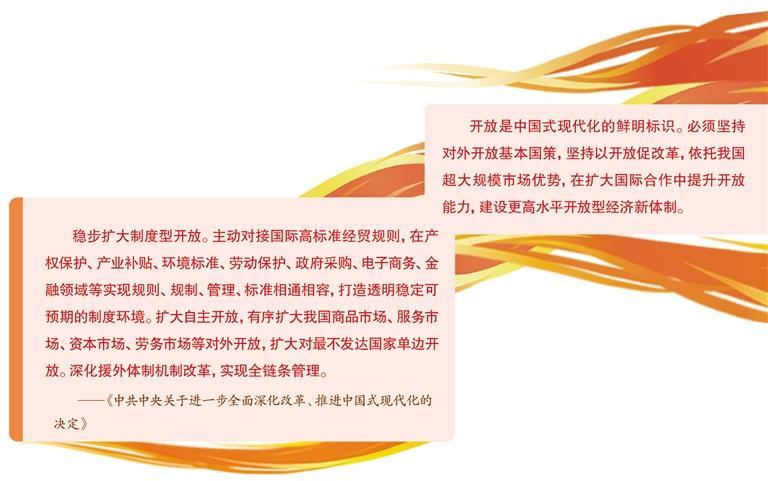 《決定》提出“穩(wěn)步擴(kuò)大制度型開放”,要求主動對接國際高標(biāo)準(zhǔn)經(jīng)貿(mào)規(guī)則?!稕Q定》作出的一系列重要部署影響廣泛、意義深遠(yuǎn)。