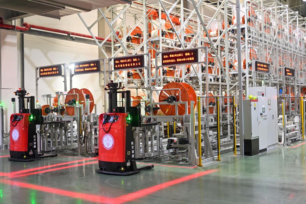 7月26日,無人叉車在杭州中策錢塘實(shí)業(yè)有限公司輪胎數(shù)字工廠車間內(nèi)裝運(yùn)物料。新華社記者 江漢 攝