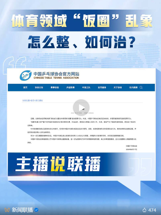 這兩天,中國乒協(xié)、中國體操協(xié)會(huì)相繼發(fā)聲,譴責(zé)體育領(lǐng)域的“飯圈”亂象。這一亂象到底該怎么整?如何治?點(diǎn)擊視頻↓↓↓