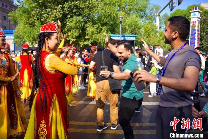 22日,民族風情街上,巴基斯坦媒體人與當?shù)鼐S吾爾族居民一起跳起維吾爾族舞蹈。陳欣怡 攝
