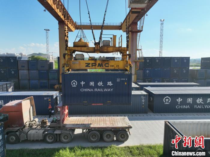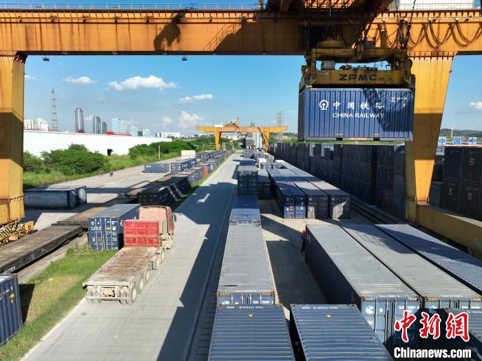 8月26日,廣西南寧國(guó)際鐵路港內(nèi),鐵路職工頂著下午的烈日,正在為發(fā)往越南的貨運(yùn)班列裝卸貨物。該鐵路港是廣西始發(fā)中越班列的核心場(chǎng)站。國(guó)鐵南寧局提供的信息顯示,今年前7個(gè)月,廣西始發(fā)中越班列累計(jì)發(fā)運(yùn)貨物6850標(biāo)箱,同比增長(zhǎng)16倍;其中7月份發(fā)運(yùn)1922標(biāo)箱,超過(guò)今年一季度發(fā)運(yùn)量總和,為今年以來(lái)第三次刷新單月發(fā)運(yùn)量紀(jì)錄。圖為集裝箱擺滿(mǎn)場(chǎng)站,等待裝車(chē)。王以照 攝