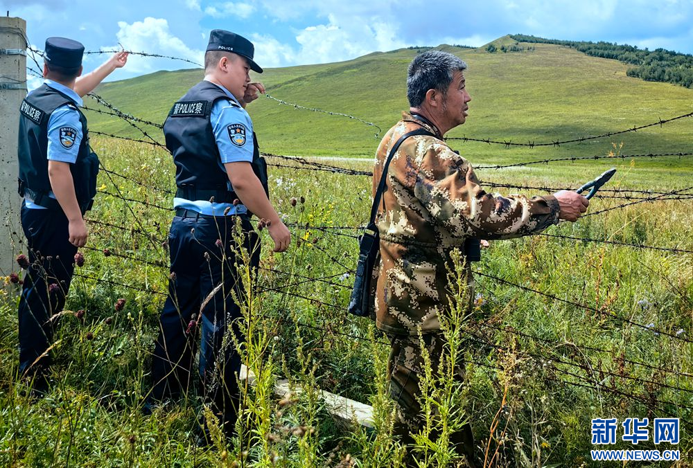 ??王玉發(fā)(右)與邊境警察在修補(bǔ)網(wǎng)圍欄。新華網(wǎng)發(fā)