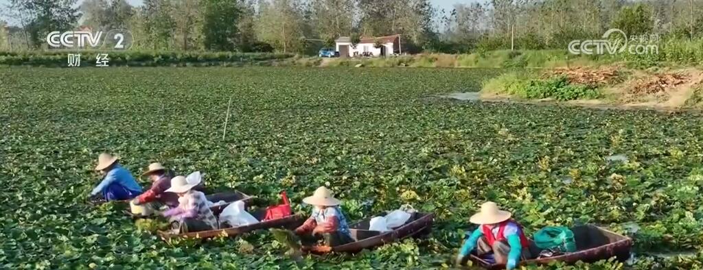 傍晚時分,采菱的村民劃著小船穿梭在碧波綠葉中,從水下扯起一根根菱角藤,采摘綠中帶粉的菱角。不一會兒,船艙就被塞得滿滿當當。