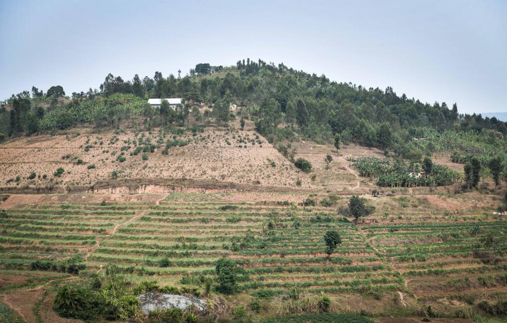 這是8月15日在盧旺達南方省拍攝的一處使用等高線種植巨菌草活籬笆和梯田套種農(nóng)作物模式的水土保持田。