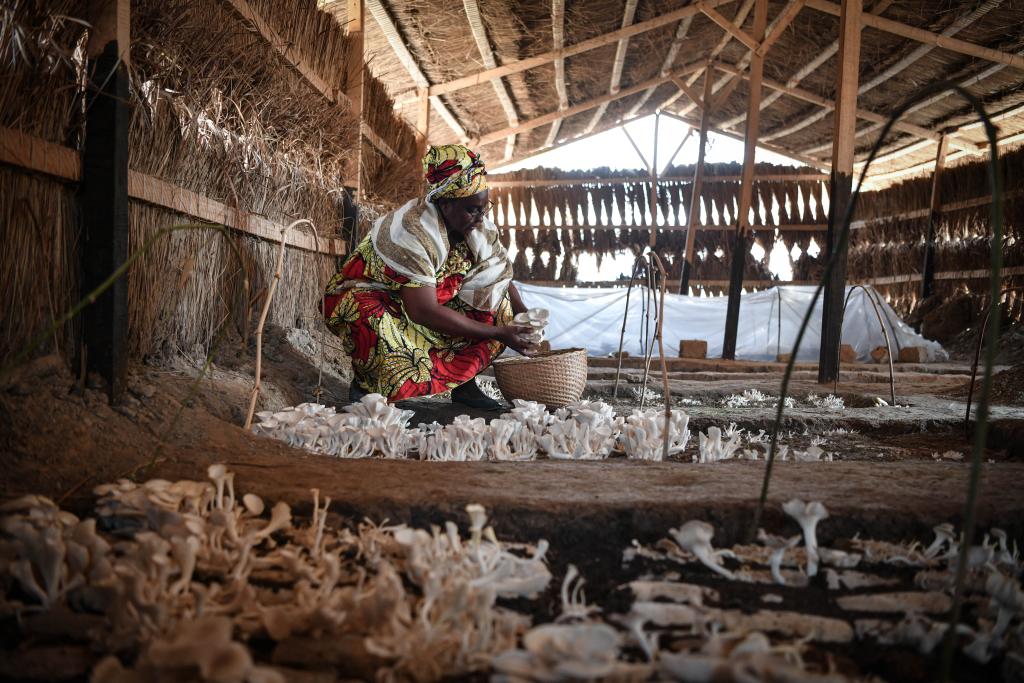 2月6日,在中非共和國達馬拉,法蒂瑪在菇棚內(nèi)收獲菌草菇。