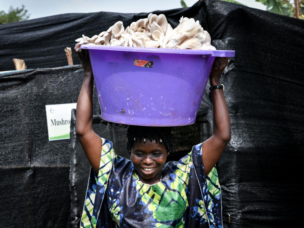 在中非共和國達馬拉市一處貧困村落里,法蒂姆·阿巴·雷基亞正在自家的菇棚內(nèi)收獲鮮菇。