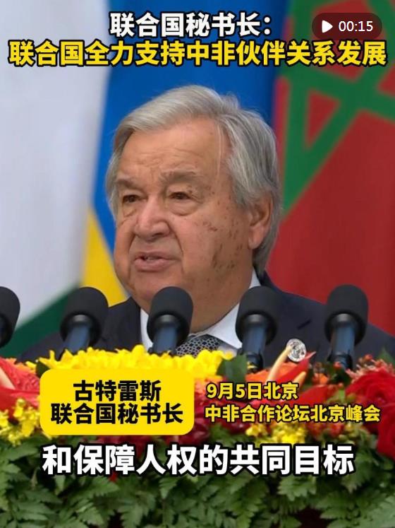 聯合國秘書長古特雷斯5日在中非合作論壇北京峰會開幕式上說,聯合國將全力參與支持中非發(fā)展堅固的伙伴關系,推動世界實現和平、可持續(xù)發(fā)展和保障人權的共同目標。
