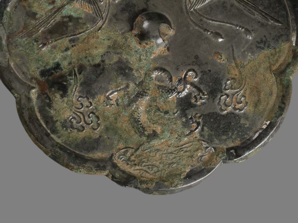 銅鏡呈八瓣葵花形,在中央的鏡鈕四周,自下而上分三個(gè)部分構(gòu)成了由水面到天空的立體空間。最下層為波光粼粼的一汪水面,雖然這一部分留存有因長期埋藏地下而產(chǎn)生的銹跡,但仍依稀可辨碧波之上有一條昂首翹尾的龍。它四肢張開,龍尾反折向龍首上方并纏繞于一足之上,龍身兩側(cè)各一朵祥云,襯托出神龍騰躍翻飛的身姿。