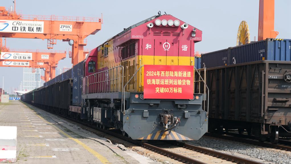 2024年9月14日,一列帶有突破60萬標(biāo)箱標(biāo)志的鐵海聯(lián)運班列準(zhǔn)備從欽州鐵路集裝箱中心站駛出。新華社記者 張愛林 攝