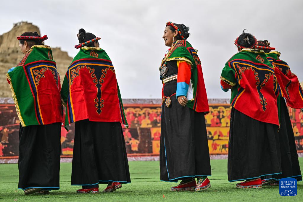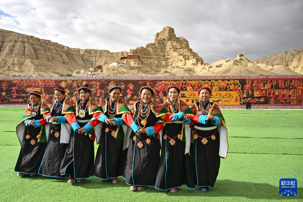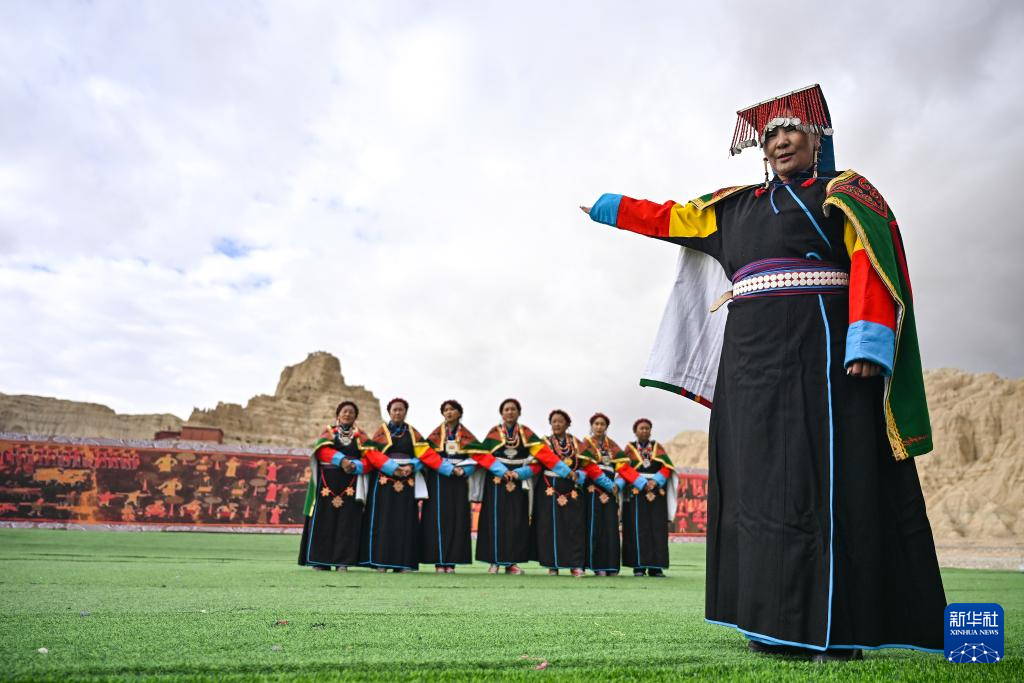 在西藏阿里地區(qū)札達(dá)縣古格王國(guó)遺址腳下,自治區(qū)級(jí)“宣舞”非遺傳承人央金(右)介紹“宣舞”(9月11日攝)。