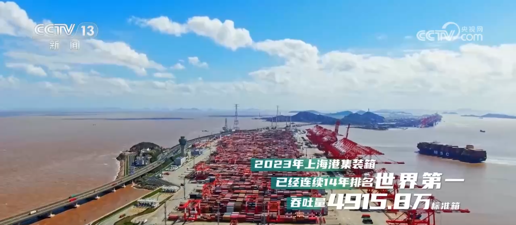 2023年,上海港集裝箱已經(jīng)連續(xù)14年排名世界第一,吞吐量4915.8萬標(biāo)準(zhǔn)箱。