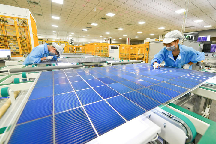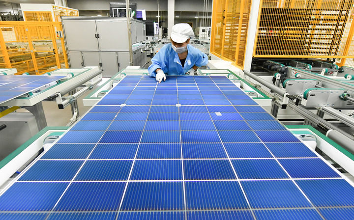 8月20日,工作人員在安徽華晟新能源科技股份有限公司的異質(zhì)結(jié)光伏電池及組件工廠內(nèi)作業(yè)。