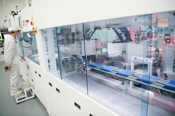 安徽合肥,全球單體產(chǎn)能最大的異質(zhì)結(jié)光伏電池及組件一體化工廠,工業(yè)機(jī)器人將一個個硅片投送到一架白色機(jī)器的腔體,經(jīng)過綿延的智能化流水線,狀如手機(jī)大小、薄如紙片的光伏電池片便下線了。