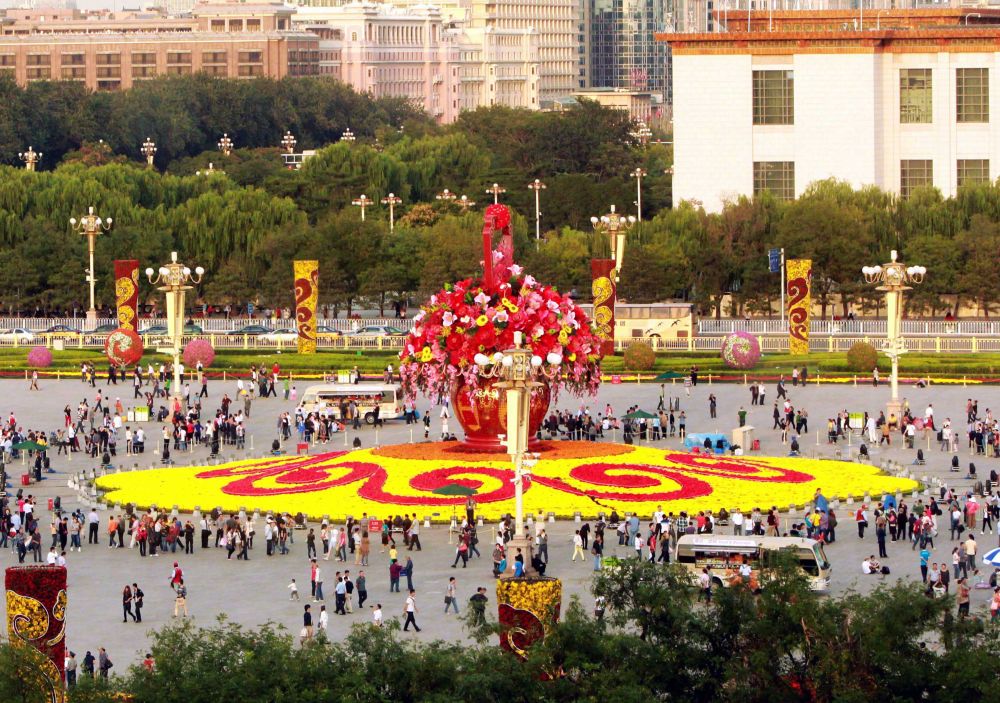 2012年9月26日,游客在天安門廣場“祝福祖國”巨型花籃前參觀拍照。新華社記者 邢廣利 攝