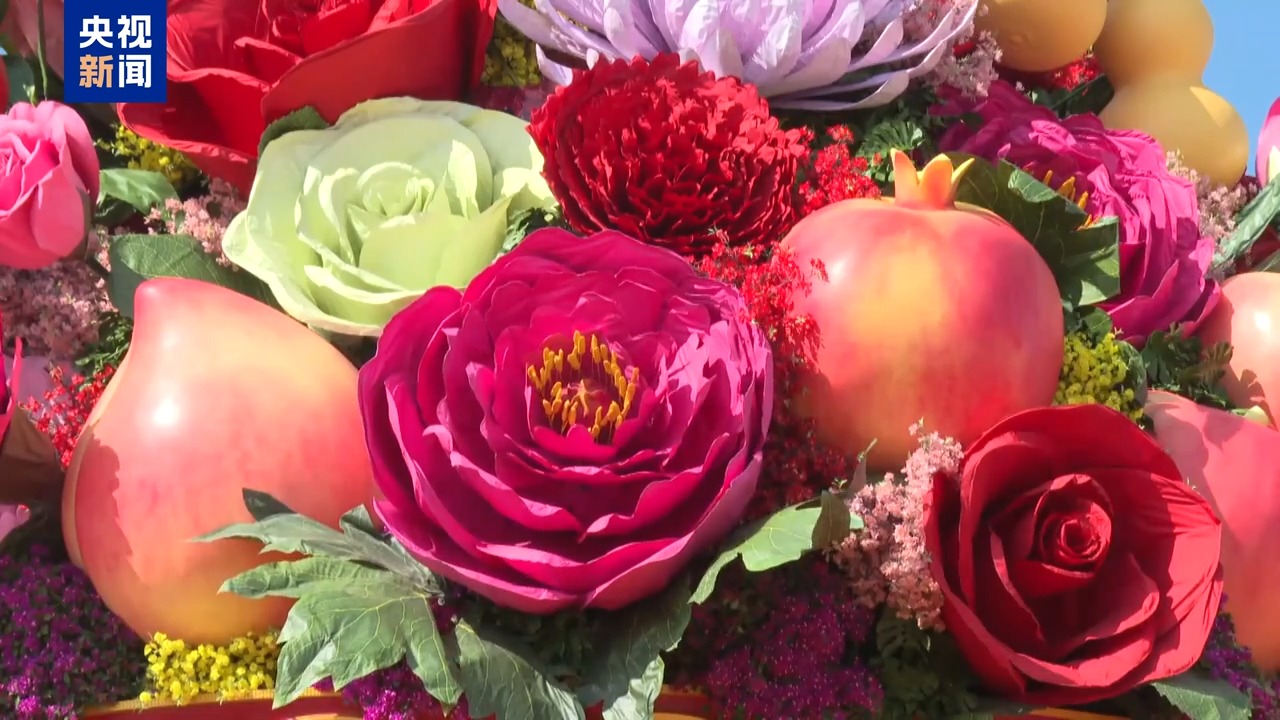 “祝福祖國(guó)”大型花壇以喜慶的蔬果花籃為主景,花壇頂高18米,籃體高16米,籃盤直徑12米。花壇底部直徑45米,為如意圖案,寓意吉祥如意、國(guó)泰民安。今年的花壇首次以“蔬果花籃”呈現(xiàn),籃內(nèi)選取了美好寓意的蔬果和花卉,體現(xiàn)“蔬果飄香,繁花似錦”。