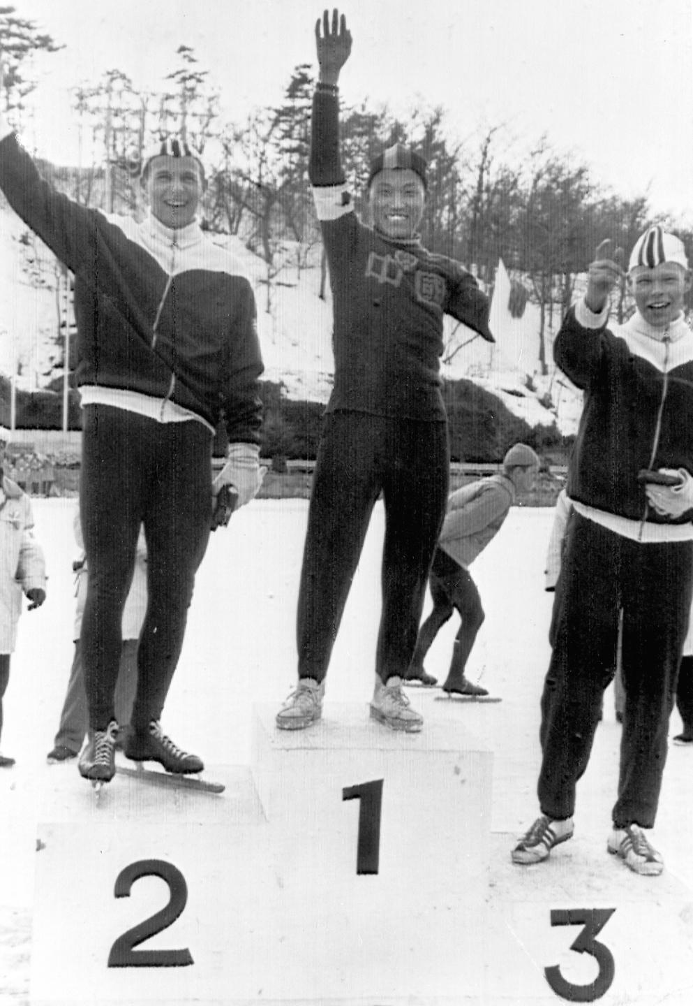 1963年2月24日,在日本舉行的世界速度滑冰錦標(biāo)賽中,羅致煥獲得男子1500米項目冠軍。這是中國運(yùn)動員第一次取得冰雪項目的單項世界冠軍。圖為羅致煥(中)受獎后向觀眾致意。 新華社發(fā)(資料照片)
