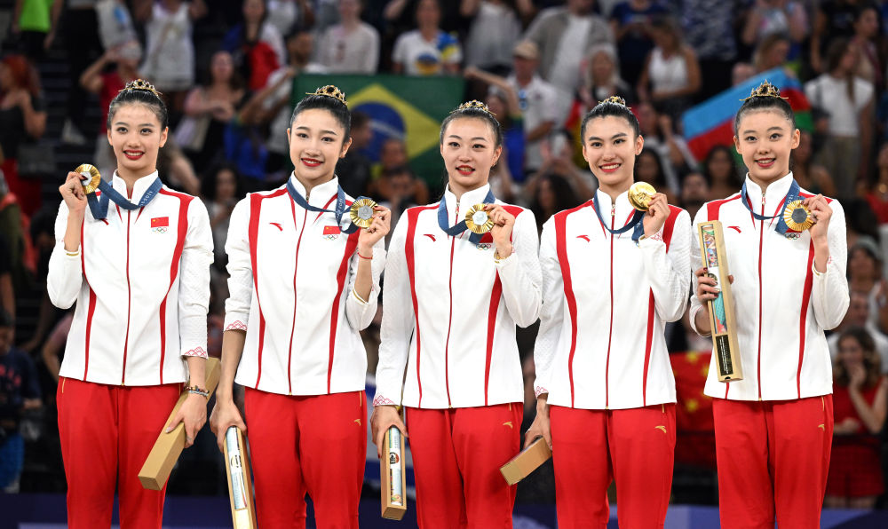 8月10日,中國隊在頒獎儀式上。當(dāng)日,在巴黎奧運(yùn)會藝術(shù)體操項目集體全能決賽中,中國隊獲得冠軍。新華社記者 程敏 攝
