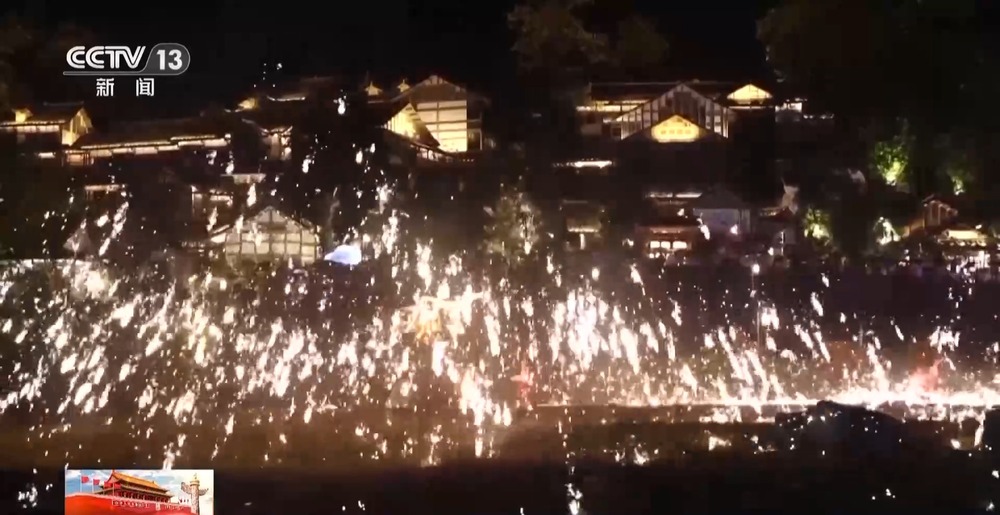 隨著夜幕降臨,非遺打鐵花、篝火狂歡派對等節(jié)目陸續(xù)開始,讓游客感受東方之美、中國之韻。10月1日到7日,烏江寨新增民族盛裝巡游、萬人大合唱、無人機光影秀等內(nèi)容,從早到晚輪番上演,為游客們呈上一場文化大餐。