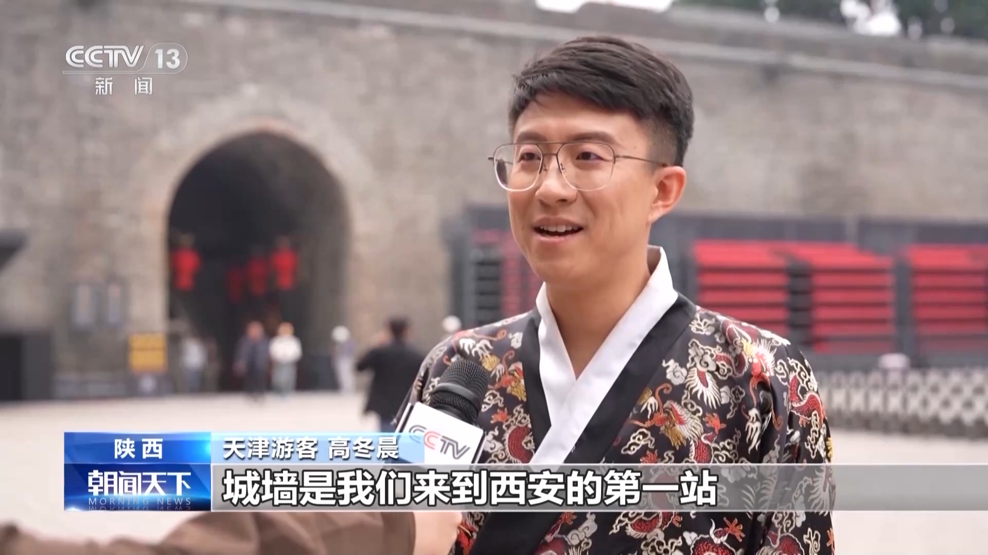 天津游客 高冬晨:城墻是我們來(lái)到西安的第一站,來(lái)了之后第一個(gè)感覺(jué)就是這里非常雄偉,非常震撼,而且非常有文化底蘊(yùn)。