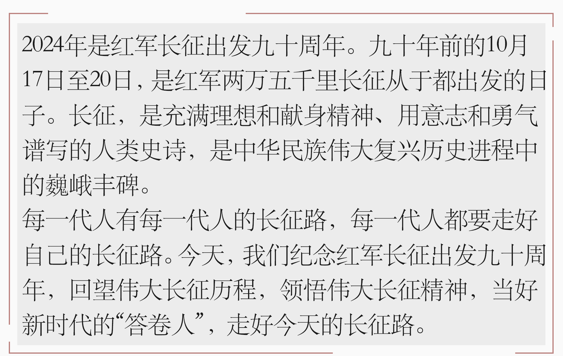 按照日程表的規(guī)定,八萬六千多名紅軍戰(zhàn)士向于都集結,準備踏上漫漫征程,在血與火中趟出了一條走向新生、走向勝利的革命道路。