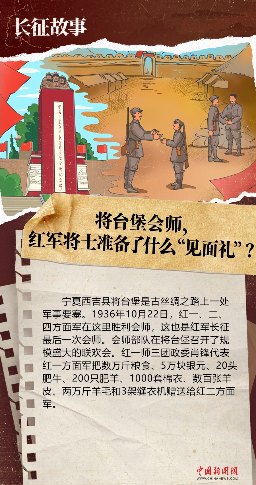寧夏西吉縣將臺堡是古絲綢之路上一處軍事要塞。1936年10月22日,紅一、二、四方面軍在這里勝利會師,這也是紅軍長征最后一次會師。會師部隊在將臺堡召開了規(guī)模盛大的聯(lián)歡會。紅一師三團(tuán)政委肖鋒代表紅一方面軍把數(shù)萬斤糧食、5萬塊銀元、20頭肥牛、200只肥羊、1000套棉衣、數(shù)百張羊皮、兩萬斤羊毛和3架縫衣機(jī)贈送給紅二方面軍。