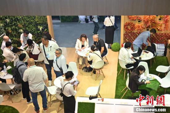 第136屆廣交會(huì)第二期的園林用品展區(qū)吸引采購(gòu)商(左)咨詢(xún)洽談。
