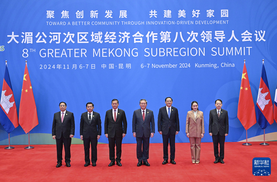 11月7日,國務(wù)院總理李強在昆明出席大湄公河次區(qū)域經(jīng)濟合作第八次領(lǐng)導人會議。這是李強同出席會議的柬埔寨、老撾、緬甸、泰國、越南政府首腦和亞洲開發(fā)銀行行長合影。新華社記者 殷博古 攝