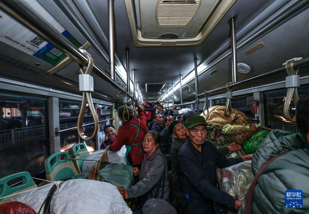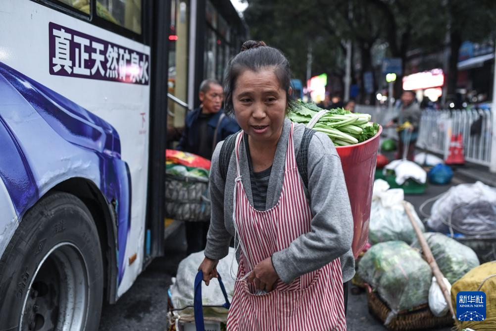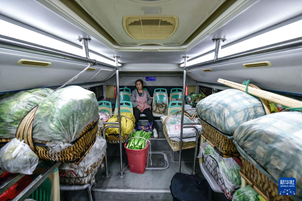 菜農(nóng)從貴陽(yáng)市烏當(dāng)區(qū)水田鎮(zhèn)定扒村乘坐252路“惠農(nóng)專(zhuān)線”公交車(chē)進(jìn)城賣(mài)菜(11月7日攝)。