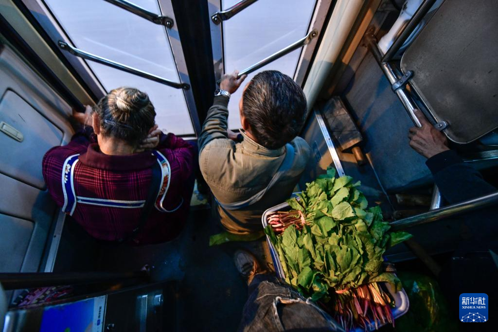在貴陽(yáng)市烏當(dāng)區(qū)水田鎮(zhèn)定扒村,菜農(nóng)乘坐252路“惠農(nóng)專(zhuān)線”公交車(chē),準(zhǔn)備進(jìn)城賣(mài)菜(11月7日攝)。