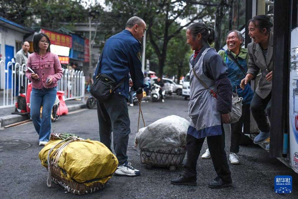 菜農(nóng)乘坐252路“惠農(nóng)專(zhuān)線”公交車(chē)抵達(dá)貴陽(yáng)市大營(yíng)坡終點(diǎn)站下車(chē)時(shí)與搭手幫忙的駕駛員交談(11月7日攝)。