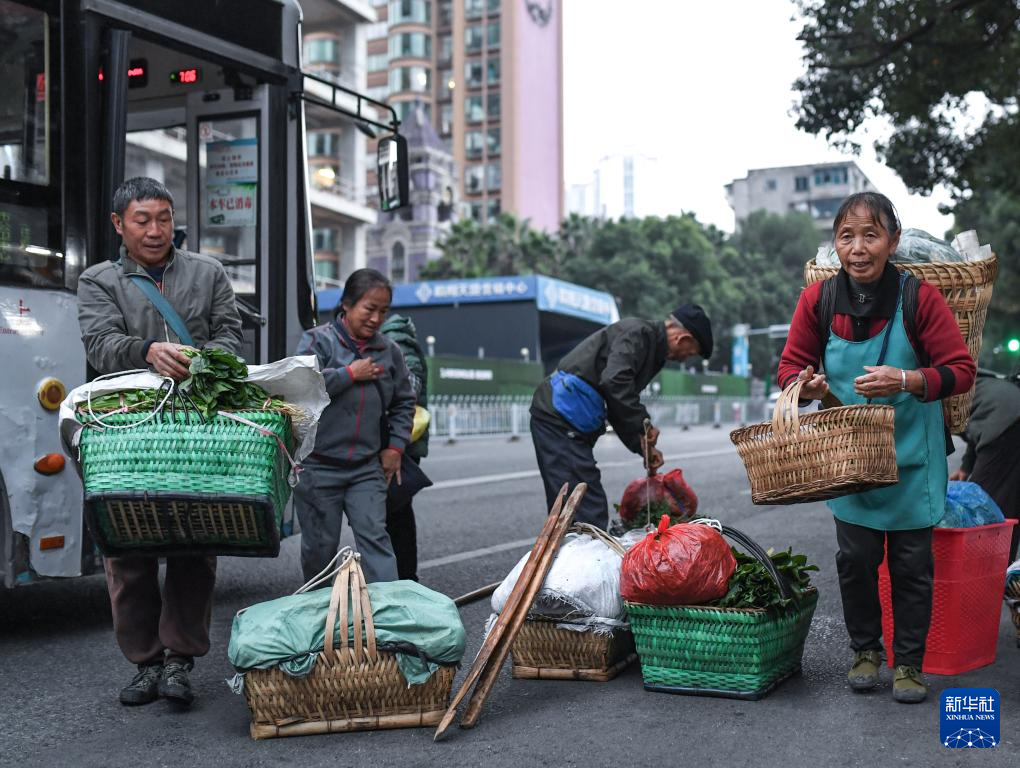 菜農(nóng)乘坐252路“惠農(nóng)專(zhuān)線”公交車(chē)抵達(dá)貴陽(yáng)市大營(yíng)坡終點(diǎn)站,準(zhǔn)備將蔬菜就近售賣(mài)(11月7日攝)。