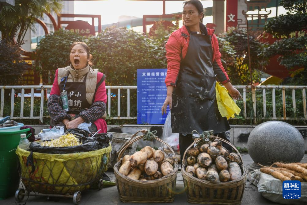 乘坐252路“惠農(nóng)專(zhuān)線”公交車(chē)進(jìn)城的菜農(nóng)在貴陽(yáng)市大營(yíng)坡附近賣(mài)菜(11月7日攝)。