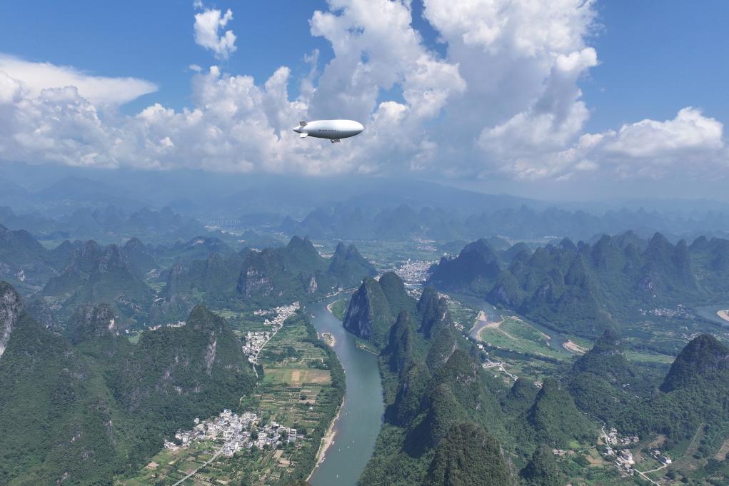 9月14日,“祥云”AS700載人飛艇在廣西陽朔進(jìn)行演示飛行(無人機(jī)照片)。新華社發(fā)(中國航空工業(yè)集團(tuán)特種飛行器研究所供圖)