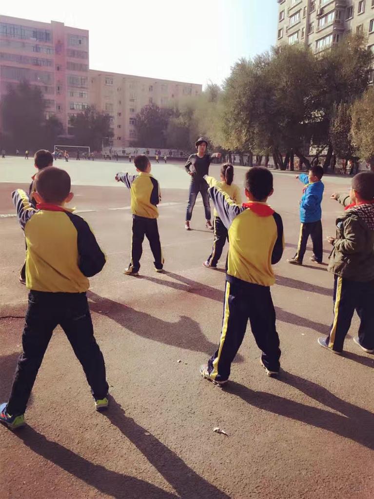 地里娜爾在烏魯木齊市的一所小學帶領孩子們練習拳法。 受訪者供圖
