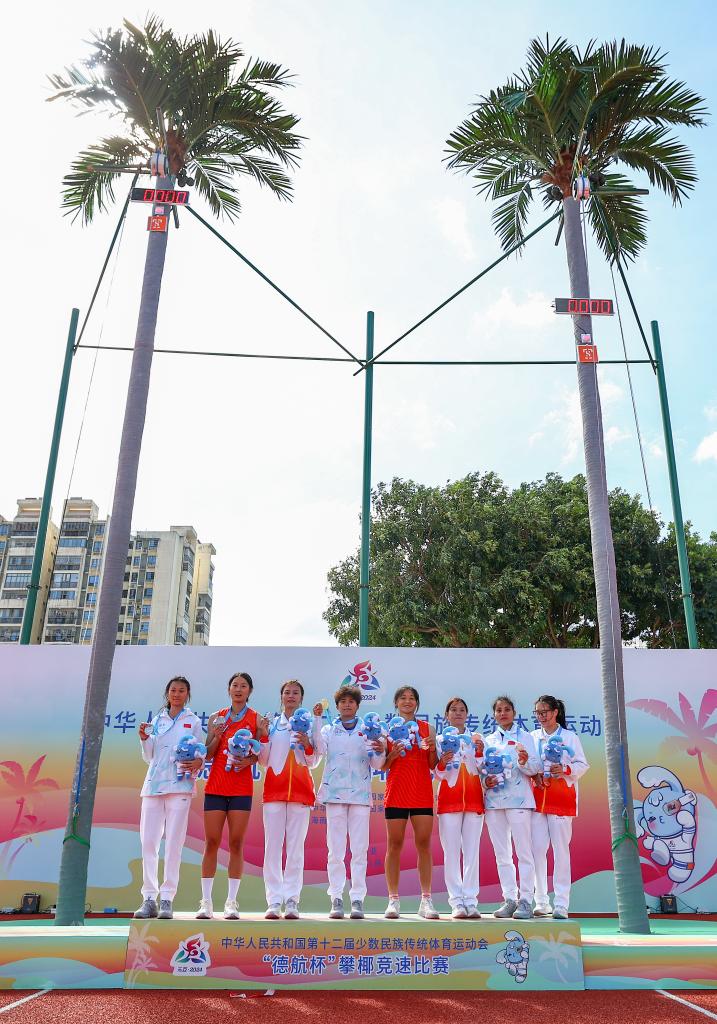 24日,第十二屆全國少數(shù)民族傳統(tǒng)體育運(yùn)動會攀椰競速比賽結(jié)束爭奪,海南隊(duì)的羅軍和符詩軍分獲男子、女子一等獎。