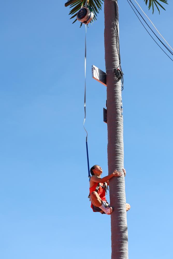 這項(xiàng)起源于海南群眾摘椰勞作的比賽既像沒有巖點(diǎn)的速度攀巖,又像垂直騰躍的跑酷。比賽中,運(yùn)動員在9米(女子7米)的人造椰樹上攀爬,“樹干”筆直,六七秒之間便已決出勝負(fù),扣人心弦的比賽令觀眾發(fā)出潮水般的歡呼。