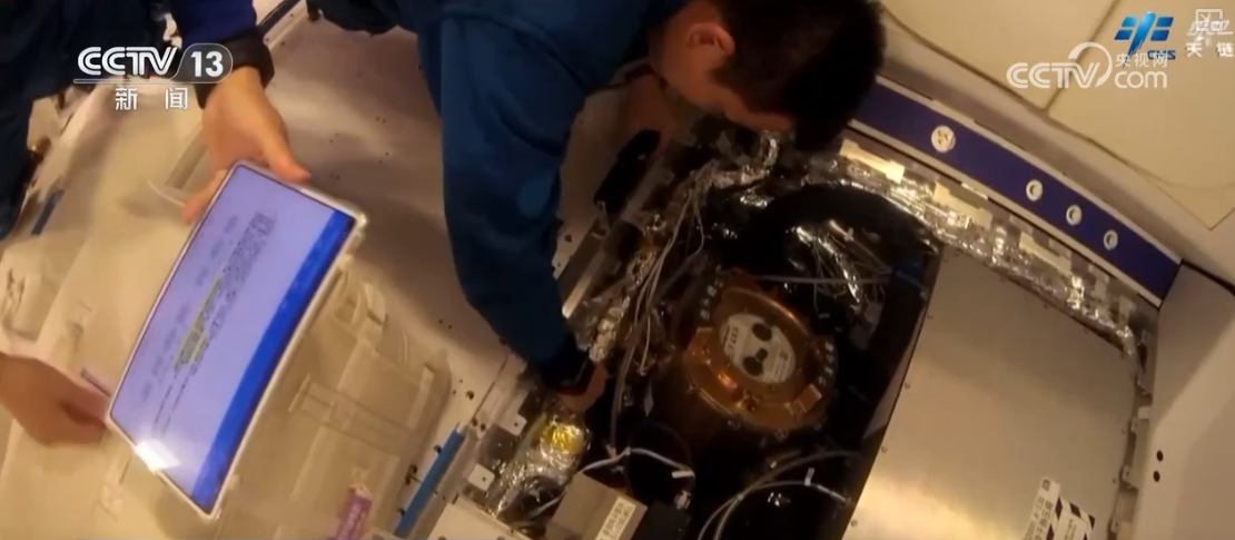 乘組還完成了流體物理實驗柜固液介觀實驗單元樣品盤檢查、實驗樣品更換,無容器柜實驗腔體樣品清理、實驗樣品更換、軸心機構電極維護等多項操作。
