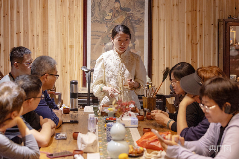 在倒扒獅街,“90后”安慶姑娘秦無顏是一家文化主題會館的主理人。在她的會館里,檀木、玉石等制作而成的新中式文玩飾品、傳統(tǒng)工藝面料制作而成的“新中式”服裝、古色古香的“新中式”茶館,定期舉行的雅集活動……無一不體現(xiàn)著獨特的東方美學。2020年,在上海從事珠寶設(shè)計工作的她返回家鄉(xiāng)經(jīng)營起這家文化空間?!凹戎鹦?,也尋根。”她希望,客人來到這里,放慢腳步,在交流與體驗中感受傳統(tǒng)文化的魅力,豐富精神體驗。