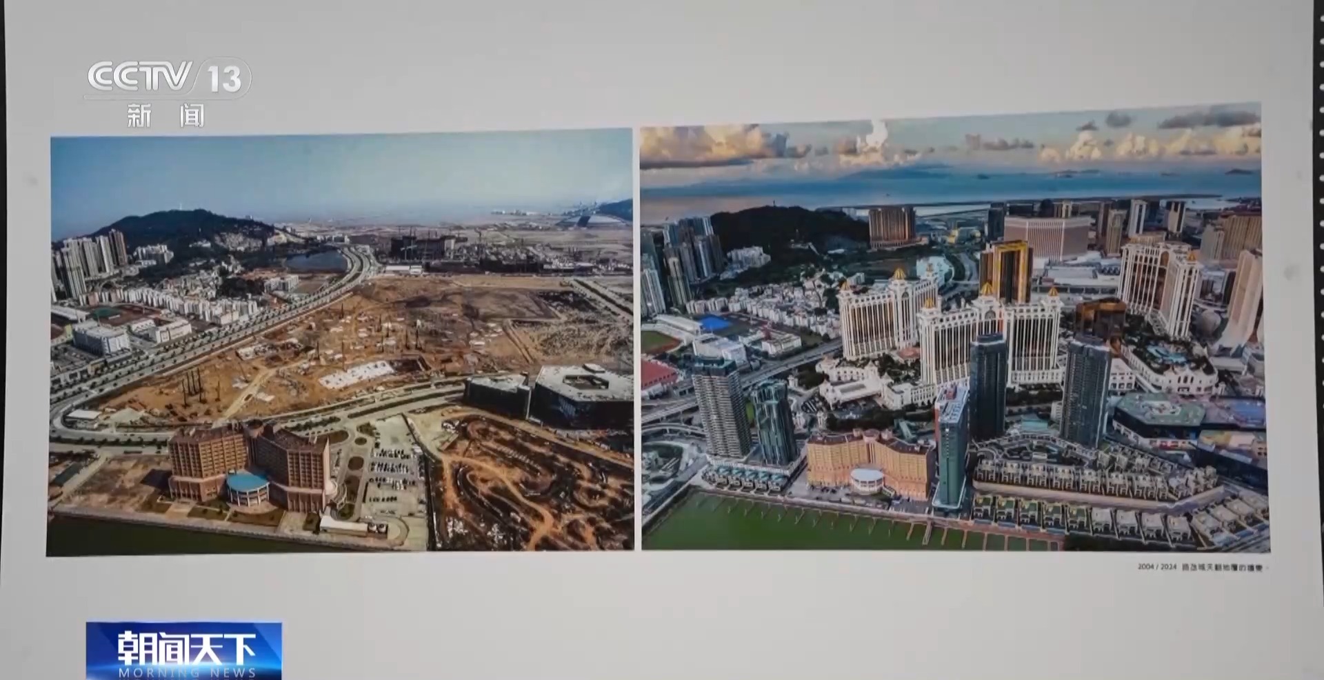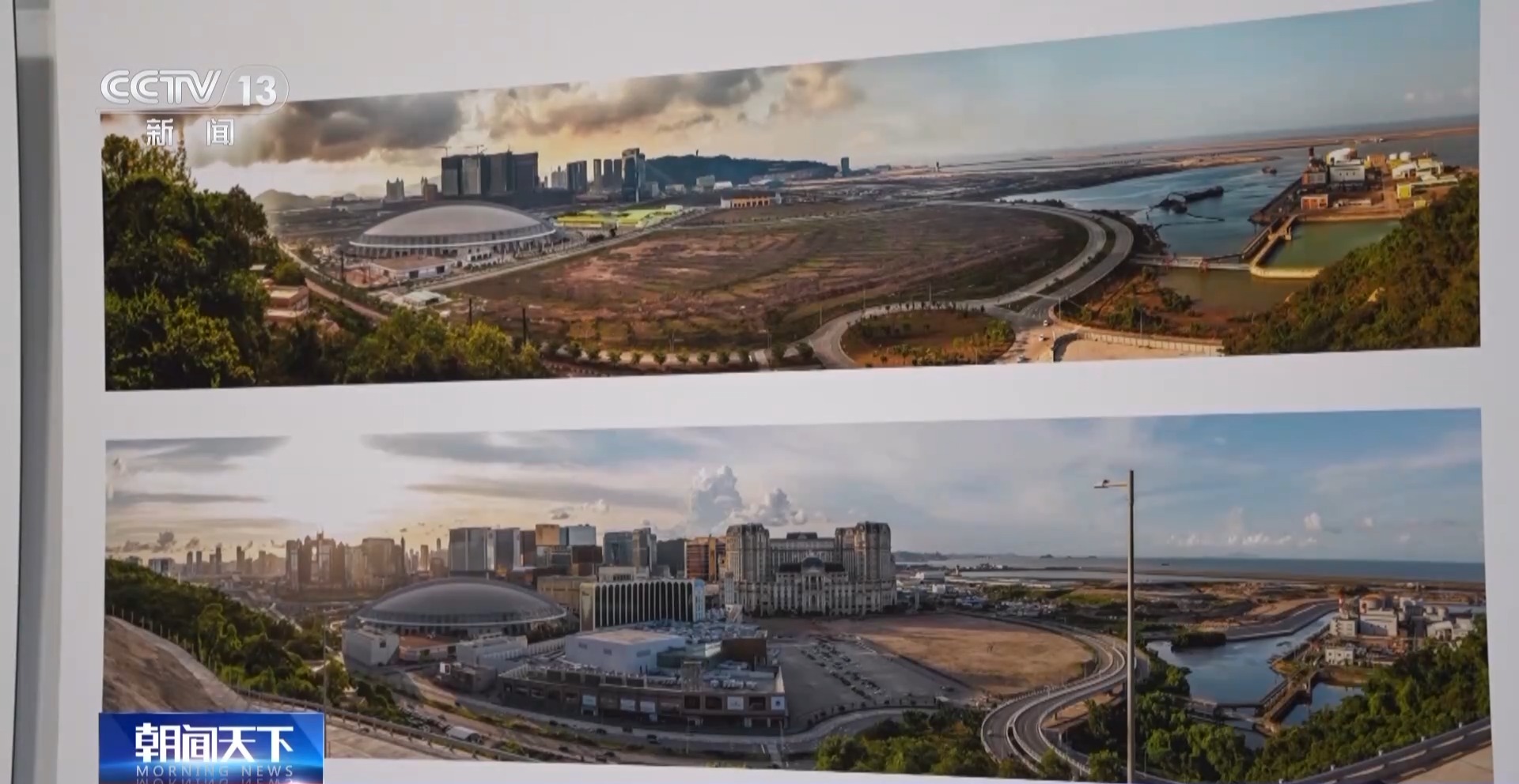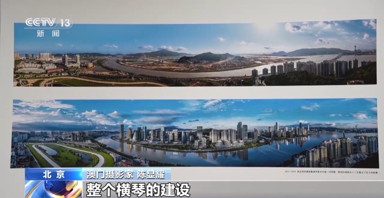 澳門攝影家 陳顯耀:回歸之后,隨著我們澳門的發(fā)展,也是帶動周邊區(qū)域一起發(fā)展繁榮。我們畫面看到的是橫琴,上面的照片是2012年的時候,橫琴都是山體,在準備開發(fā)了。下面是成立的橫琴粵澳深度合作區(qū),整個橫琴的建設也為我們澳門的發(fā)展建設提供了一個很重要的支撐、保障。